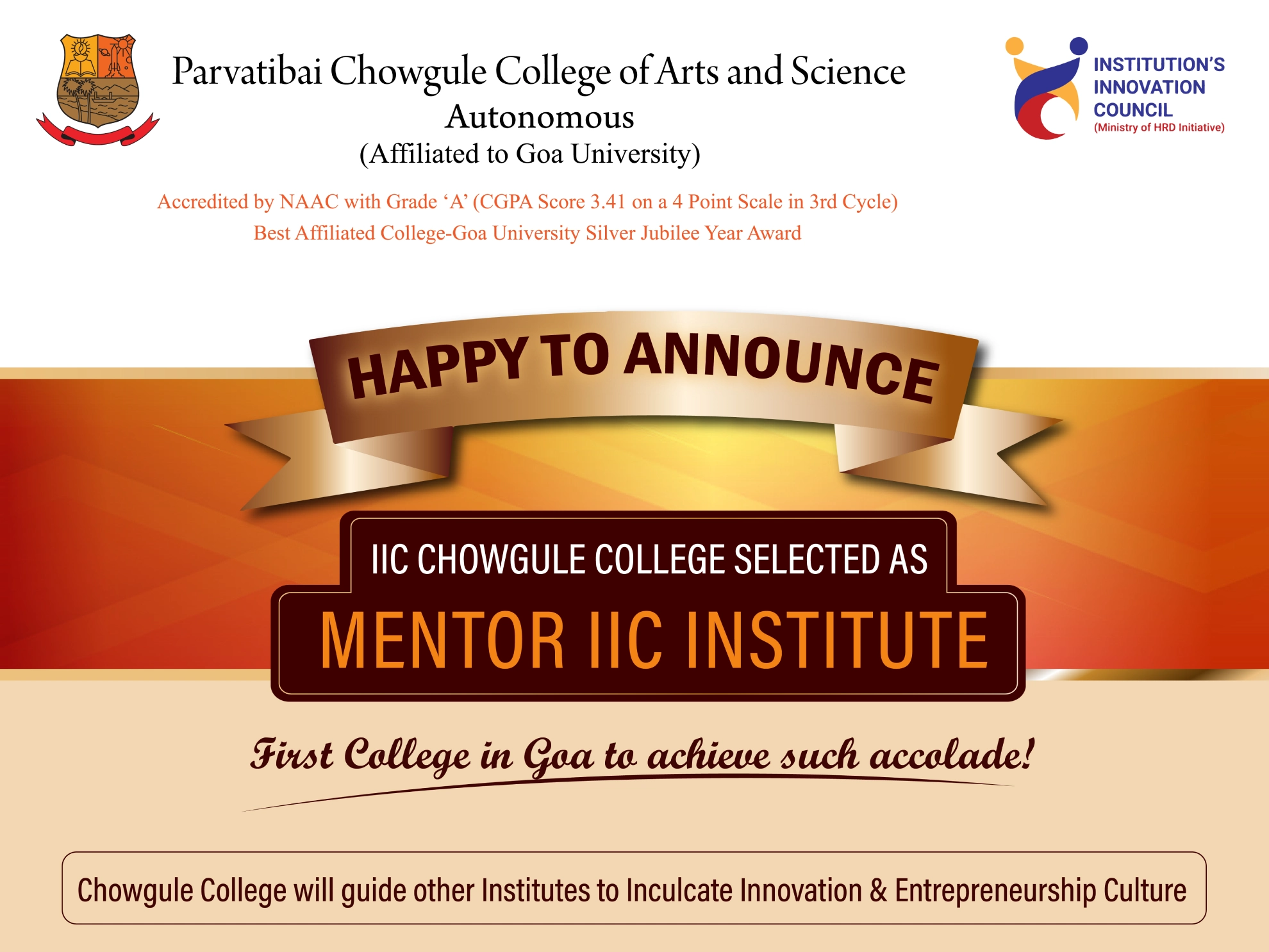 “Our College is selected as a Mentor institute as part of the Mentor-Mentee Program of IIC, MIC. Our College is the only College in the state of Goa to be selected as a Mentor institute”